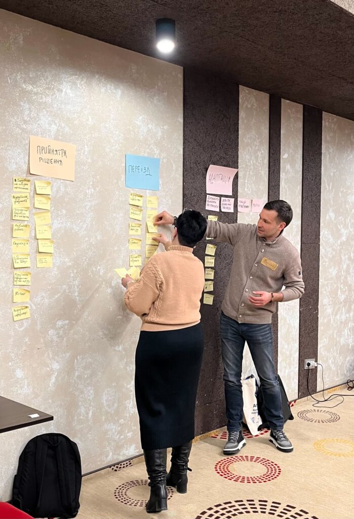 Учасни_ці воркшопу окреслили потреби, які мають внутрішньо переміщені люди на різних етапах — ухвалення рішення, переїзду та адаптації на новому місці. Насамперед згадували про потребу в житлі та працевлаштуванні. Вони також наголосили на несистемності та неузгодженості наявних політик підтримки внутрішньо переміщених людей.